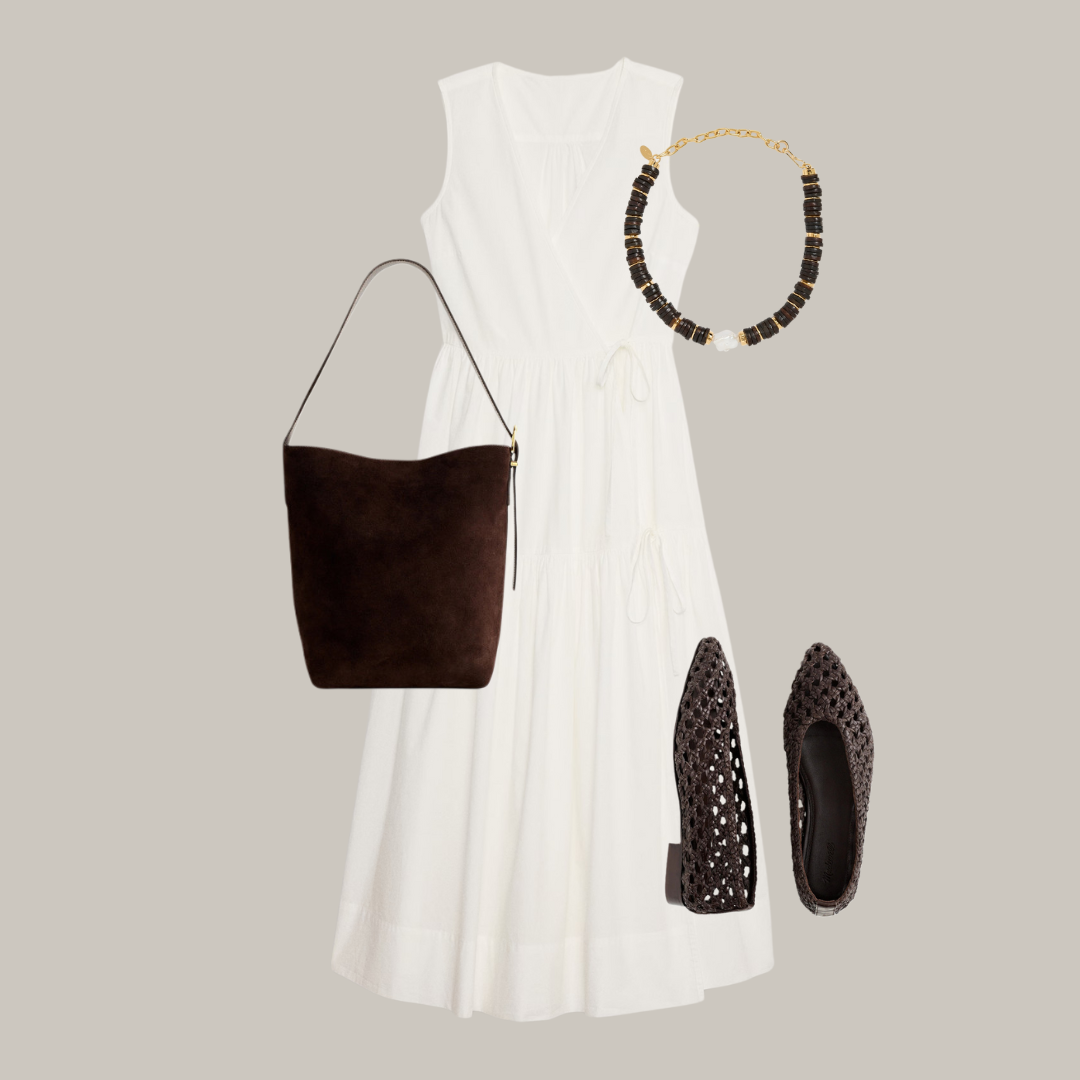 Start incorporating jewelry and bags that say fall. For example, pull out your dark brown suede tote (or start a hunt for a new one for fall!). Or, use darker necklaces and earrings and wear with a white dress to create a more moody look that speaks fall.